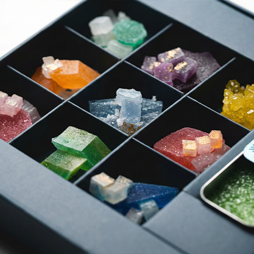 Strawberry, banana, peach, coconut, mango, raspberry, melon, apple and watermelon flavours are captured in nine delicate crystals. This signature box also comes with a packet of our special sour dust to elevate the experience.